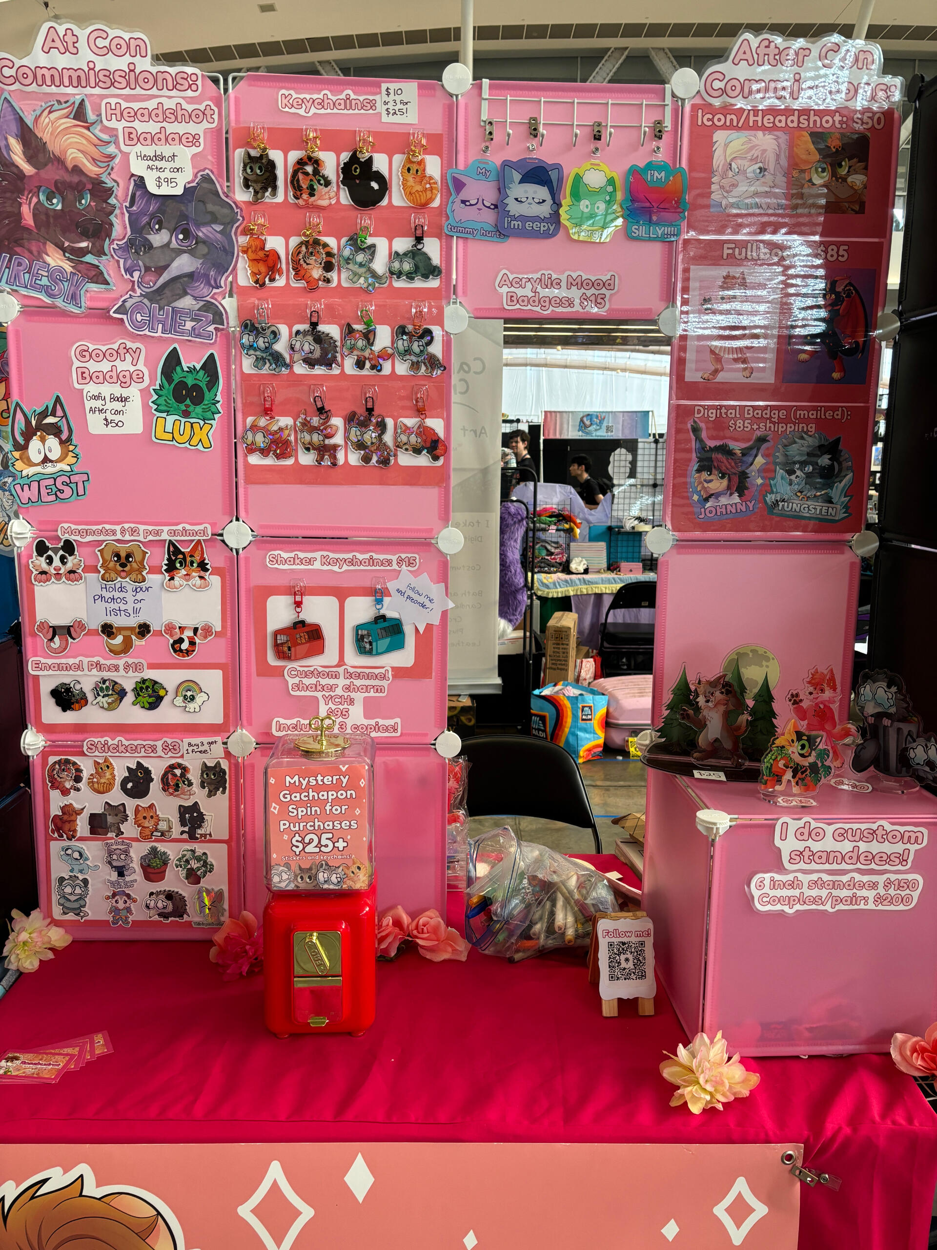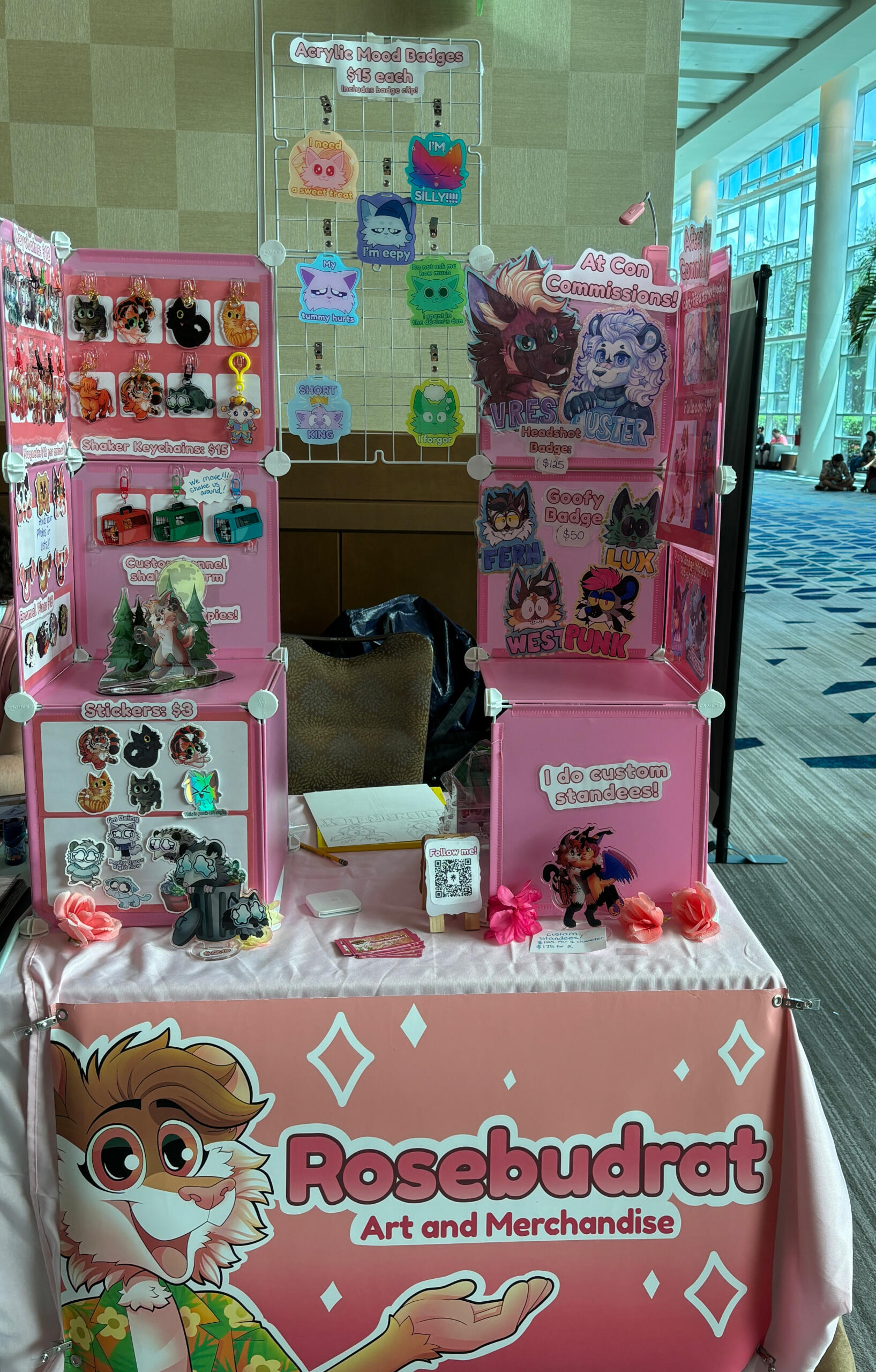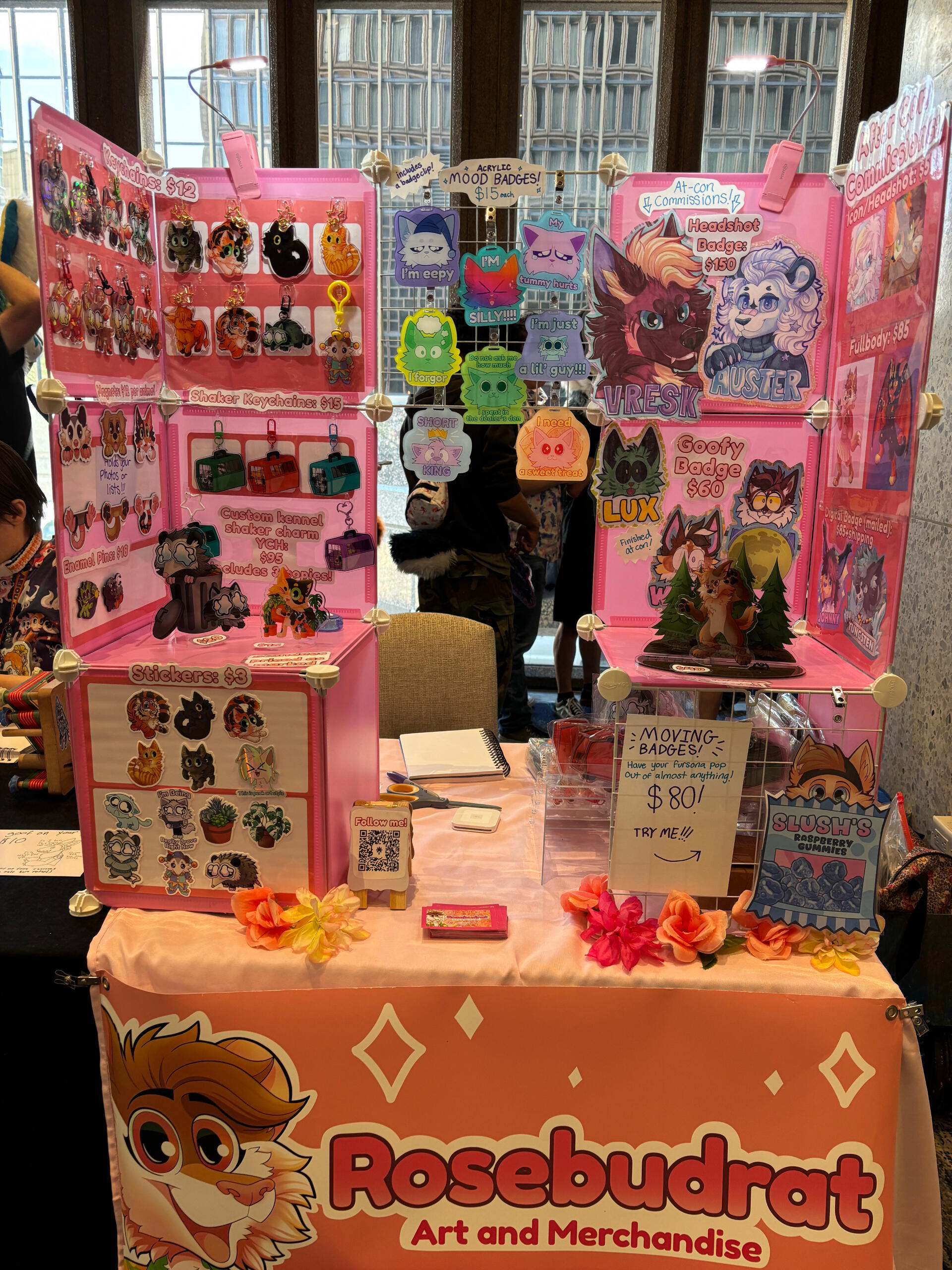 Hello! I'm Rosebudrat, and drawing cute, goofy animals is what I do best! I love trying new things, and I'm always looking for fun new types of merchandise I can create with my art.One thing I specialize in at cons is "at-con" commissions. I draw fast, and can get a lot done in one weekend! At Megaplex 2024, I did 33 badges and over 10 table sketches over the course of 1 weekend.In addition, I currently offer keychains, enamel pins, stickers, magnets, and standees. I am in the process of getting blankets and fanny packs made! I also make acrylic "mood badges" which are premade wearable badges with goofy phrases on them. They're my most popular table item!Thank you for considering me for this event, and if you have any questions, please reach out.